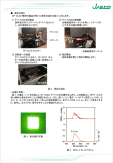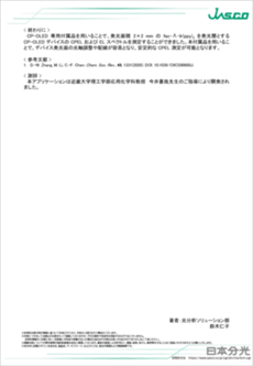 CP-OLED は、電圧を印加することによって円偏光発光を生じるデバイスであり、3D ディスプレイなどへの応用が期待されています1)。CP-OLED の CPEL 特性評価は、CPL 測定システムを用いて行われています。本測定では、CP-OLED 専用付属品を使用することで、デバイス発光面の光軸調整および電極配線が容易となり、安定した測定が可能となります。ここでは、専用付属品を用いて、fac-Λ-Ir(ppy)3を発光層とする CP-OLED デバイスの CPEL 特性評価を行った結果を示します。