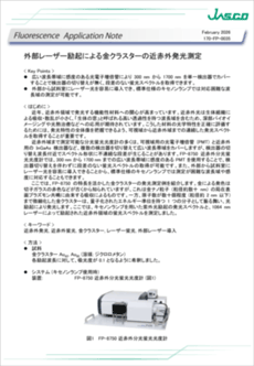 ここでは、FP-8750 の特長を活かした金クラスターの発光測定例を紹介します。金による発色は切子ガラスの赤色などが古くから知られていますが、これは金ナノ粒子(粒径約数十 nm)の局在表面プラズモン共鳴に由来する吸収によるものです。一方、原子数が数十個程度(粒径約2 nm 以下)まで微細化した金クラスターは、量子化されたエネルギー準位を持つ1つの分子として振る舞い、光励起により発光します。ここでは、キセノンランプを用いた紫外光励起の発光スペクトルと、1064 nm レーザーによって励起された近赤外領域の蛍光スペクトルを測定しました。