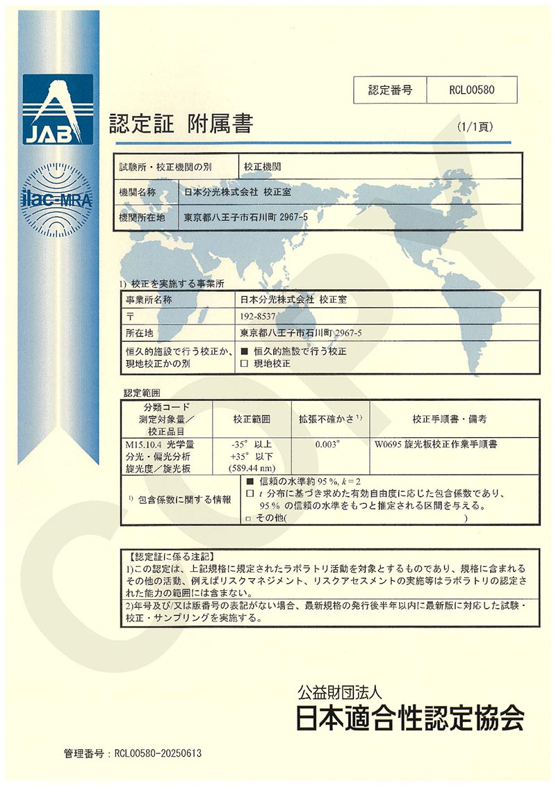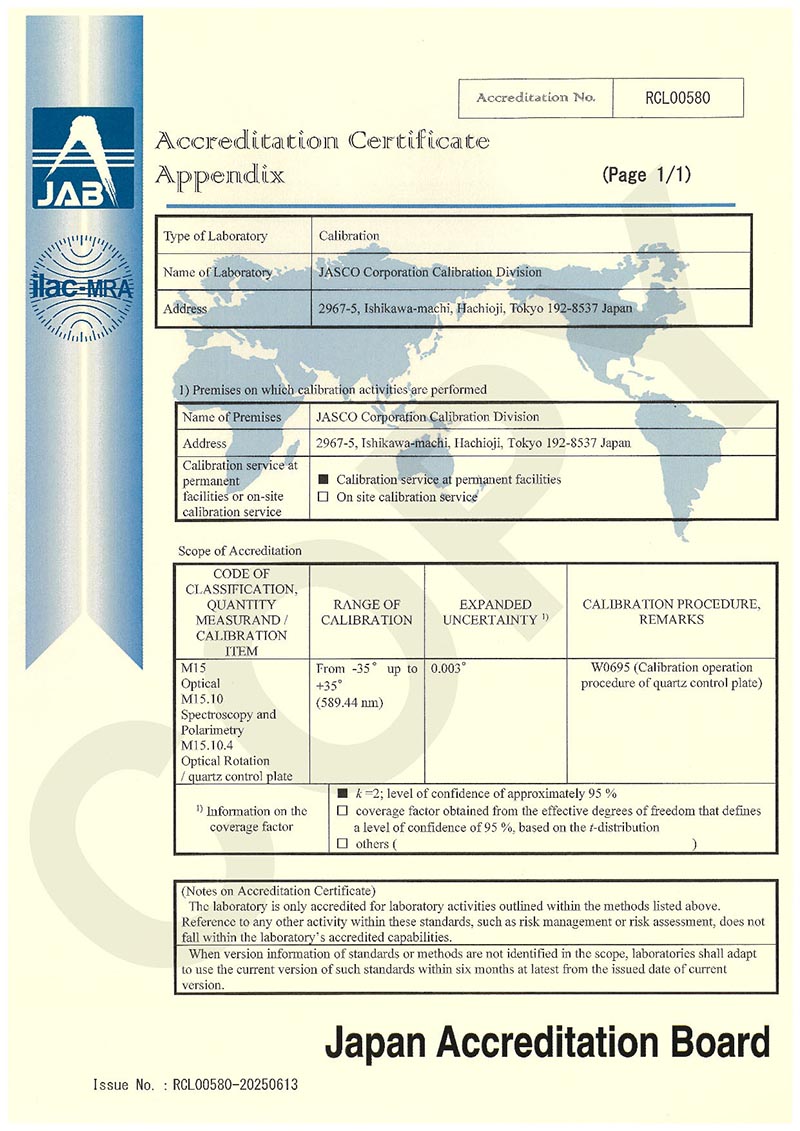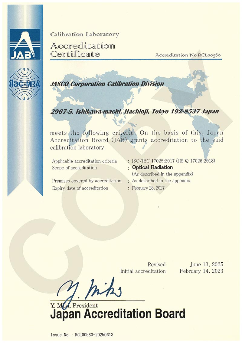 日本分光は、創立以来一貫して光分析機器の開発、製造及び販売事業を展開して参りました。近年の計測機器の校正ニーズの高まりを受け、上記の ISO/IEC 17025 認定を取得いたしました。品質・環境マネジメントシステムと併せ、より高品質な製品・サービスをご提供していく所存です。