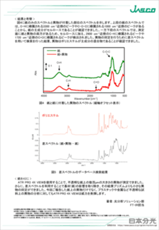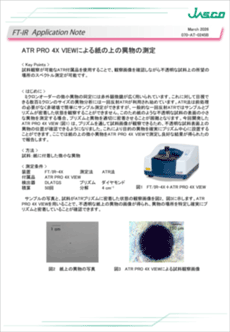 ミクロンオーダーの微小異物の同定には赤外顕微鏡が広く用いられています。これに対して目視できる数百ミクロンのサイズの異物分析には一回反射ATRが利用され始めています。ATR法は前処理の必要がなく非破壊で簡単にサンプル測定ができますが、一般的な一回反射ATRではサンプルとプリズムが密着した状態を観察することができません。このため紙のような不透明な試料の表面の小さな異物を測定する場合、プリズムと異物を適切に密着させることが困難となります。今回開発した ATR PRO 4X VIEW は、プリズムを通して試料画像が観察できるため、不透明な試料表面上の異物の位置が確認できるようになりました。これにより目的の異物を確実にプリズム中心に設置することができます。ここでは紙の上の微小異物を ATR PRO 4X VIEW で測定し良好な結果が得られたので報告します。