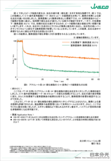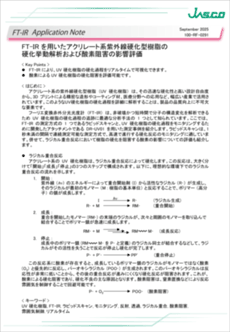 フーリエ変換赤外分光光度計 (FT-IR) は、非破壊かつ短時間で分子の構造変化を解析できるため UV 硬化樹脂の硬化過程の追跡に最適な分析手法の 1 つとして知られています。ここでは、FT-IR の測定方式の 1 つであるラピッドスキャンと、UV 硬化樹脂の硬化過程をモニタリングするために開発したアタッチメントである DR-UV01 を用いた測定事例を紹介します。ラピッドスキャンは、1秒未満の間隔で連続測定可能な測定方式で、高速で進行する硬化反応のモニタリングに適しています。併せて、ラジカル重合反応において樹脂の硬化を阻害する酸素の影響についての評価も紹介します。