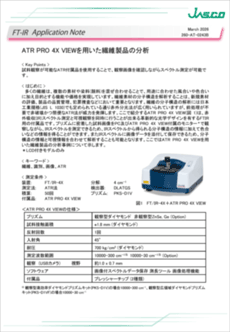 多くの繊維は、複数の素材や染料(顔料)を混ぜ合わせることで、用途に合わせた風合いや色合いに加え目的とする機能や価格を実現しています。繊維素材の分子構造を解析することは、新規素材の評価、製品の品質管理、犯罪捜査などにおいて重要となります。繊維の分子構造の解析には日本工業規格(JISL1030)でも定められている通り赤外分光法が広く用いられていますが、前処理が不要で非破壊かつ簡便な ATR 法が威力を発揮します。ここで紹介する ATR PRO 4X VIEW は、赤外吸収(IR)スペクトル測定と可視観察を同時に行うことが出来る革新的な光学デザインを有する FTIR 用の付属品です。プリズムに密着した試料画像を PC で観察しながら、IR スペクトルを測定できるため、IR スペクトルから得られる分子構造の情報に加えて色合いなどの情報を得ることができます。また IR スペクトルに画像データを添付して保存できるため、分子構造の情報と可視情報を合わせて解析することも可能となります。ここでは ATR PRO 4X VIEW を用いた繊維製品の分析事例について示します。