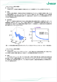 ここではそれぞれの測定法の特徴と測定事例について紹介します。各測定法はFTIRの干渉計内にある移動鏡のスキャン方式が異なります。「インターバル測定」では通常のスキャン、「ラピッドスキャン測定」では高速スキャンにより時間変化測定を行います。「ステップスキャン測定」ではデータサンプリングポイント毎に移動鏡を静止して、各ポイント毎にサンプルに摂動を与えて時間変化測定を行います。