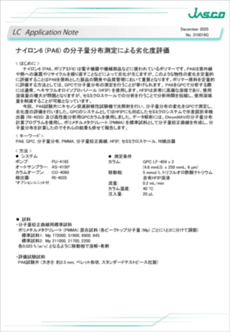 ナイロン6(PA6、ポリアミド6) は電子機器や機械部品などに使われているポリマーです。PA6は紫外線や熱への暴露やリサイクルを繰り返すことなどによって劣化が生じますが、このような物性の変化を定量的に評価することはPA6を原料とした製品の開発や品質管理において重要となります。ポリマー原料を定量的に評価する方法としては、GPCで分子量分布の測定を行うことが挙げられます。PA6をGPCで分析する際には通常、ヘキサフルオロイソプロパノール(HFIP) を使用します。HFIPは非常に高価な溶媒であり、使用溶媒量の増大が問題となりますが、セミミクロスケールでの分析を行うことで分析時間を短縮し、使用溶媒量を削減することが可能となっています。