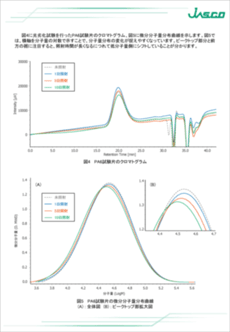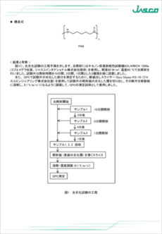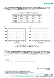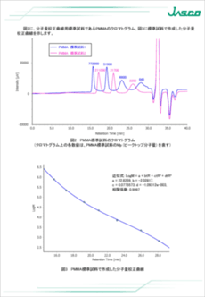 今回、PA6試験片にキセノン促進耐候性試験機で光照射を行い、分子量分布の変化をGPCで測定し、劣化度の評価を行いました。GPCのシステムとしてはHFIPにも対応したセミミクロシステムで示差屈折率検出器(RI-4035)及び高性能分析用GPCカラムを使用しました。データ解析には、ChromNAVの分子量分布計算プログラムを使用し、ポリメチルメタクリレート(PMMA)を標準試料として分子量校正曲線を作成し、分子量分布を計算したのでそれらの結果も併せて報告します。