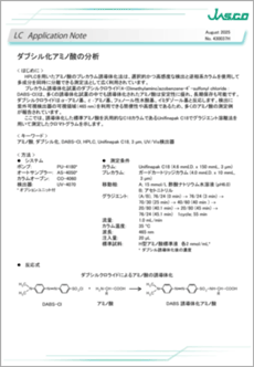 プレカラム誘導体化試薬のダブシルクロライド(4-(Dimethylamino)azobenzene-4′-sulfonyl chloride : DABS-Cl)は、多くの誘導体化試薬の中でも誘導体化されたアミノ酸は安定性に優れ、長期保存も可能です。ダブシルクロライドはα-アミノ基、ε‐アミノ基、フェノール性水酸基、イミダゾール基と反応します。検出に紫外可視検出器の可視領域(465 nm)を利用できる簡便性や高感度であるため、多くのアミノ酸の測定例が報告されています。